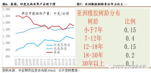天然橡胶树龄结构偏年轻化,2020产能供给压力较大。天然橡胶产区主要集中在东南亚,目前亚洲橡胶树龄结构仍然偏年轻化,一般橡胶树龄在6-8年即可割胶,经过3-4年的开割,产量趋于稳定即树龄在9-12年,树龄在12-30年产量明显下降,而目前亚洲橡胶树龄7-12年占比较大,橡胶树处于产能逐步释放的阶段,产能供给压力较大。