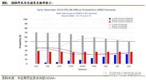 2020年厄尔尼诺现象发生概率较小。厄尔尼诺现象大多始发于5-8月,持续时间通常在半年以上,入夏一般会造成东南亚干旱,并导致我国南方地区多雨,当厄尔尼诺现象较为强烈时,天然橡胶减产效应升温,据NOAA数据显示,目前厄尔尼诺现象发生概率在20%附近,若明年夏季无极端天气,天然橡胶产量会有所增加。
