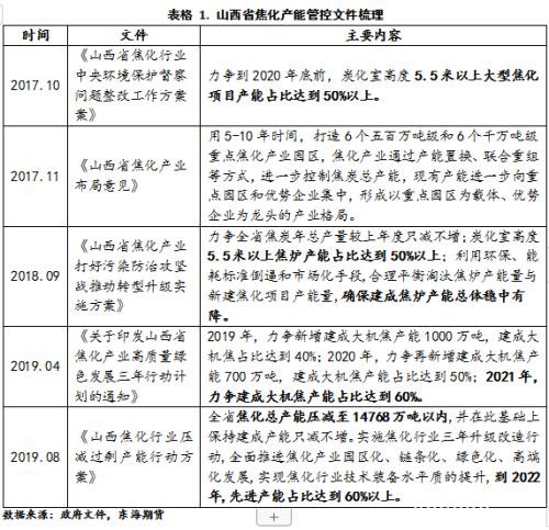 从山西近3年的焦化产能管控的政策表述上也能看出,山西焦化产能淘汰以4.3米焦炉产能的去化为主线,并借此提高省内5.5米以上焦炉的产能占比。所以政府的表述中不止一次的提到了“5.5米以上大型焦化项目产能占比达到50%以上。”而我们从最近文件的表述上看,山西省把“大型机焦产能达到60%以上”的时间节点从2021年延后到了2022年,我们认为山西淘汰4.3米焦炉的计划进度正在被逐渐推后。