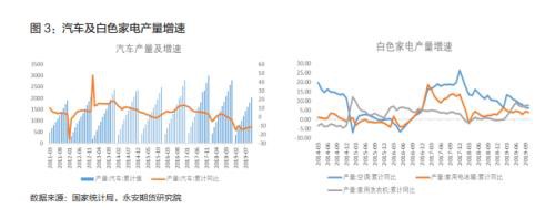 从固定资产投资来看,房地产投资增速处于高位,支撑了今年的钢铁需求。2019 年 1-10月份,房地产开发投资完成额同比增加 10.3%,较年初有所回落,但较去年同期增加了 0.6 个百分点。而基建投资虽然持续改善,但增速较为有限,同比增速仍处于低位。2019 年 1-10 月份,基建投资完成额同比增加 3.26%。受贸易战影响,制造业投资较为低迷,2019 年 1-10 月份制造业投资完成额同比仅增加 2.6%,增速处于2004 年以来的绝对低位。从相关产品的产量数据来看,2019 年 1-10 月份,汽车产量同比下降 11.1%,白色家电产量同比增速虽然为正,但较上边年增速也出现大幅回落。
