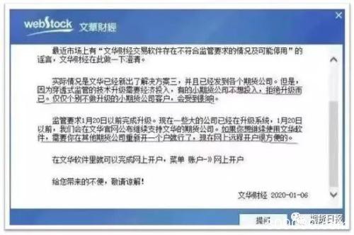 昨日下午15:58:05,西部期货发布提示公告:大意是经排查,目前文华财经交易软件暂不符合监管要求,公司会跟进整改情况,如在2020年1月21日之前仍然无法通过监管要求,对不起,请各位“上帝”不要再用文华财经交易软件啦,可以替换使用别的软件,等等。