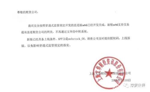 在记者获取的文华财经当日发给各期货公司的文件中,文华财经声明完全按照穿透式监管规定开发的直连版WH6已经开发完成,新版WH6支持交易通讯直连期货公司的网关,不再通过文华的中转系统(见下图)。