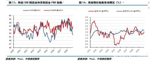 国际层面,伴随着贸易摩擦带来的负面效应,目前主要经济体均表现出经济增长放缓的迹象,未来全球主要经济体仍面临下行压力。2019年美国经济增速放缓,呈温和扩张态势,2020年美国经济大概率温和走弱,货币政策空间充裕,降低概率较大。欧洲经济前景低迷,且政局或持续动荡,为经济带来负面影响,美强欧弱局面或将延续。