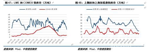 从库存变化看,铜供应偏紧的状态更加明显。截至2019年12月20日,LME铜总库存15.4万吨,较8月底的年内高点减少了18.4万吨。从历史对比看,LME库存水平与2016年二季度相当,逼近2018年底时的水平,COMEX铜库存则与2015年相当,较2018年二季度大幅下降。国内方面,上期所铜库存下半年一直处于历史低位,保税港铜库存则是持续下降,目前已低于2015年10月的32万吨,较年内高点减少37.3万吨。尽管从历史库存走势看,库存水平具有周期性波动的特征,但当前这种全球库存共振下行的情形仍旧表明,铜供应处于偏紧的状态。