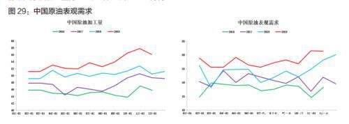 从中国原油的表观需求看, 1-11月原油表观需求累计为6.36亿吨,去年1-11月为5.89亿吨,同比增加 7.98%。从中国原油加工情况看, 2019年1-11月份中国原油加工量为5.9亿吨,去年1-11月为5.55 亿吨,同比增加6.3%。11月份中国原油隐含库存情况为同比下降248万吨,环比增加164万吨,环比呈现累库的态势。