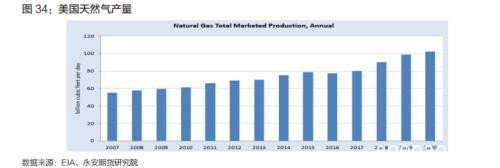随着页岩油革命,美国天然气的产量呈现突飞猛进的增加,其中天然气产量中,来自于页岩气的占比从2008年的11%的比例上升到2018年的63%。美国天然气可售产量从 2008年的211120亿立方英尺上升到2018年的 328232亿立方英尺,5年来年平均增速在5%,2018 年增速飙升到 12%。