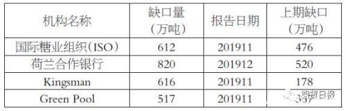 表为各机构对2019/2020榨季全球食糖缺口量预估