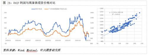 自印尼宣布禁矿以来,国内高镍铁和304不锈钢生产毛利存在明显的相互挤压。因此观察2019年8月31日印尼宣布实施禁矿以后,高镍铁和304不锈钢的加工利润,发现两者之间存在较强的负相关性,相关系数R^2达到0.7993,而这一相关性特征在以往并不显著。