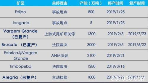 2019年6月22日Brucutu恢复运营,恢复了3000万吨/年的产能;巴西国家矿业局允许恢复的Vargem Grande Complex干法加工作业也将为2019年额外提供500万吨的产量,产能约1200万吨。11月1日,Alegria矿区也获批复产。目前,剩余停产产能约4200万吨,淡水河谷预计通过干法加工在2020年再恢复Fábrica、Timbopeba等共2300万吨的产量,在2021年通过湿法加工恢复Timbopeba和Vargem Grande Complex共2500万吨的产量。截止到2021年,淡水河谷预计将恢复5000万吨的产量。