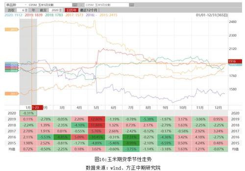 2016年取消临储玉米收购以后,我国玉米供需形势发生了极大的变化,因此我们只分析2016年以后玉米的季节性图表。从季节性图表来看,近些年在12月-次年1月基本上都会出现集中售粮带来的玉米价格下跌。2016年、2018年均是在12月出现大幅走低情况,2017年则是延迟到了次年1月下跌。2018年11月到2019年基本上都是下跌期。一方面是集中售粮,另一方面是拍出的近1亿吨巨量临储玉米出库,2019年初非瘟重大公共卫生事件倒是没有预期到后面会那么严重。