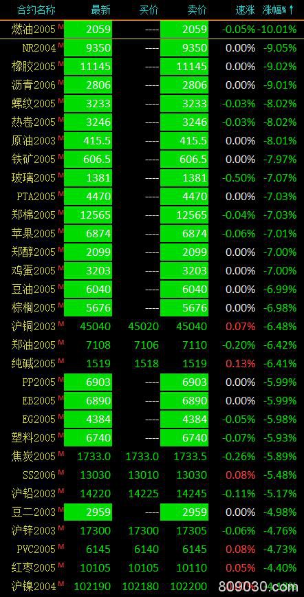 金融界网站2月3日讯 国内期货市场收盘,国内商品期货大面积收跌,螺纹钢、铁矿石、原油、燃油、甲醇、PTA等逾20个品种跌停,贵金属、铁合金、动力煤等少数品种逆势走高。