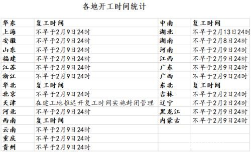 据光大期货统计数据,国内绝大多数省市已发布通知,推迟建筑工地等各类企业复工时间,多数省市复工时间不早于2月9日24时,最晚的是太原市,全省各类企业复工不早于3月1日24时。