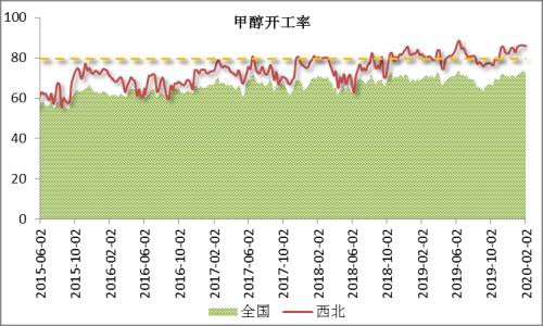 国内甲醇整体装置开工负荷为72.45%,环比下跌1.45%;西北地区的开工负荷为86.18%,环比下跌0.41%。西北地区因运输受阻,部分装置陆续开始降负运行。加之河北、河南地区部分甲醇装置停车,导致甲醇开工负荷略有下降。