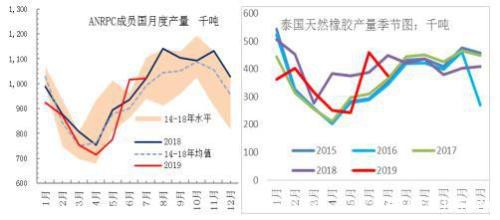产胶国进入低产季,供应边际收紧。据ANRPC,2019年1-7月天然橡胶产量607.93万吨,较2018年同期下滑10%,其中泰国1-7月产量240.19万吨,同比下滑14.8%,从产量季节性规律来看,2月以后东南亚产区陆续停割,产量会季节性收缩,供应端边际收紧。