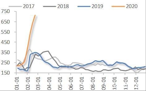 期货与现货价格走势分化,主要由预期与现实的差异导致。新冠肺炎疫情带来的恐慌情绪导致了盘面悲观情绪在春节后开盘初期集中释放,此后在政府发声支持复工后预期好转,需求延后不消失逻辑支撑期货价格走强。然而,建筑业复工进度缓慢,库存不断累积,钢厂和贸易商面临的资金压力一致为市场担忧,并对现货价格形成强力压制。