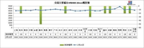 中厚板:2月25日,全国24个主要城市20mm普板均价3691元/吨,较上个交易日下跌4元/吨。其中,广州、北京、重庆、武安等7个市场下跌10-30元/吨,上海、合肥2个市场上涨20-30元/吨。