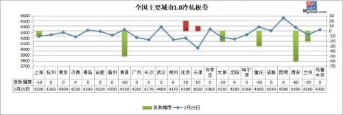 冷轧板卷:2月25日,全国24个主要城市1.0mm冷卷均价4281元/吨,较上个交易日下跌7元/吨。其中,上海、南昌、太原、重庆、西安等6个市场下跌10-60元/吨,北京、天津市场上涨10-20元/吨。