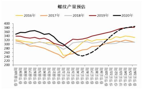 1. 据了解,华东地区已经有钢厂在复产,唐山也允许企业全面复工,再结合上述供需假设条件,预计螺纹产量自2月底后逐渐回升。但由于物流和人员返岗恢复情况还是比较缓慢,因此前期复产节奏也会偏慢,主要关注废钢到货情况,对长流程提产和短流程复产的影响。预计4月初产量能恢复到节前水平,整体恢复时间较往年延迟2周左右,到5月初能达到去年同期水平,并且后期若需求跟上,则产量同比还能给予2%左右的增长空间。