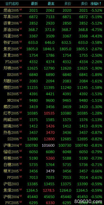 金融界网站2月27日讯 国内期货市场收盘,商品期货多数下跌。能源化工领跌,燃油、苹果、沥青跌超5%,原油、鸡蛋跌4%以上,铁矿跌逾3%,焦炭、尿素、PTA等跌2%以上;仅菜粕、豆粕、玉米等少数品种收涨。
