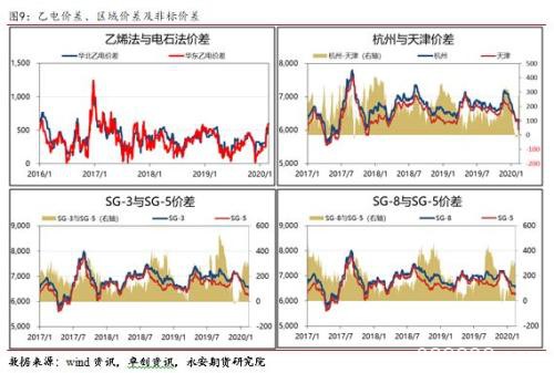 上周乙烯料价格走低,电石法价格持平,乙电价差回落;华东价格下行较多,南北价差迅速收敛;3型和8型下跌较少,和5型价差拉大后维持高位。