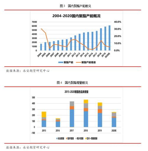 经历了17-19年国内聚酯产能的快速增长期,2020年国内预计新增产能将达到527万吨,其中瓶片145万吨,长丝320万吨,短纤37万吨,切片25万吨,总体产能增速将维持在9%左右。但由于此次公共卫生事件的影响,预计上半年聚酯产能总体投放的力度有限,在终端消费没有爆发性增长的假设下,将20年聚酯投放的预期下调至同比增速5%左右。最终国内产量同比增速在6%左右。