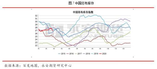 伴随着复工,织造行业依旧面临着两大困境:行业效益低下以及订单的缺失。由于3-4月份是服装企业夏季订单的集中期,受此次公共卫生影响,多数订单推迟,对于服装企业生产的刚性需求来说,短期内会有赶订单,即需求报复性回复的时期,但由于终端消费的萎靡,从订单的绝对量来说,后期仍然面临着较大的压力,且国外部分订单在事件影响下会发生转移,对后期消费的提振同样造成压力。下图为中国坯布库存指数变化趋势图,可以看到传统3-4月份是去库的旺季,后期根据坯布库存的去化幅度的不同预期也会随着改变: