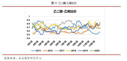 而对于EG来说,其本身作为进口依赖度较高的产品,19年进口端来自沙特的比例占46%,因而检修必定会对EG的供应也造成较大的影响。而在19年中东大幅度检修的背景下,EG在19年6月份曾达到62万吨的进口低位,那么此次检修对EG的影响几何?可以看到这次检修量几乎达到19年的2倍之多,那么是不是意味着EG的进口会因此受到更大的影响?其实不然,19年中东检修的背景下,还有一个指标需要引起进一步的注意,彼时,EG-乙烯比价曾一度触及历史低位(如下图所示),这意味着用乙烯去生产乙二醇的经济性处于历史低位,而国外乙二醇绝大部分使用的工艺是通过页岩气或者石脑油生产乙烯再合成乙二醇,因而直接出售乙烯的经济性更好,国外乙二醇装置的降负则显得顺理成章。但现在乙二醇相对乙烯的经济性并没有这么悲观,所以此次检修对于乙二醇进口的影响需要进一步的评估。同时需要注意的是,今年中美贸易缓和,来自于美国的低成本EG也将对国内EG 供应造成冲击,届时国内的产能受到进口挤压的幅度可能会更大(文中使用的93万吨乙二醇月均进口量的预测是基于19年的月均进口量以及国外新增产能的合计)。而此次原油的下跌对于EG来说成本端也必然会让出一定的空间,但需要注意的是,EG本身还受到煤化工成本的支撑,因而相对于TA,EG受到原油下跌的影响并没有那么显著,同样,当原油止跌企稳时,EG的反弹力度也会小于TA。
