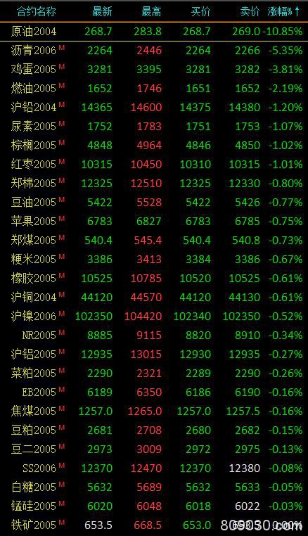 金融界网站3月11日讯 国内期货市场收盘,商品期货涨跌参半,原油收跌10.85%,盘中多次触及跌停,刷新上市以来新低。其他主力合约,沥青跌超5%,鸡蛋跌超3%,燃油跌超2%,尿素、棕榈油等跌超1%。PTA、玉米、PVC涨逾1%。