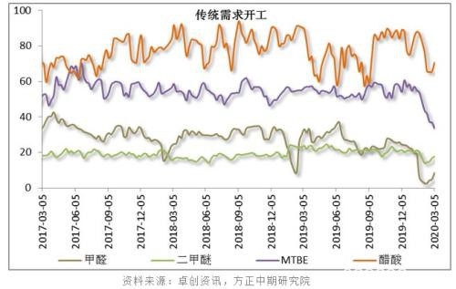 甲醇下游传统需求行业开工全面下滑,醋酸行业开工相对尚可,甲醛开工率出现断崖式下滑,不足一成。冬季正值传统需求淡季,表现已是不温不火。春节假期传统需求行业工厂停工放假,对甲醇需求进一步回落。节后复工时间延后及复工速度滞缓,传统需求始终处于低迷状态。截至3月初,醋酸平均开工率为76.08%,MTBE平均开工率为46.19%,二甲醚平均开工率为17.83,甲醛平均开工率为9.72%。
