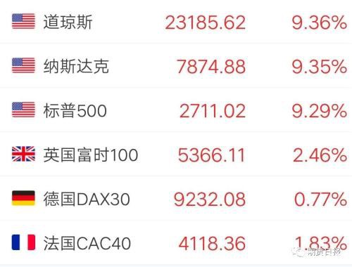 截至收盘,道指上涨1985点,涨幅9.36%,报23185.62点;标普500指数上涨230.38点,涨幅9.29%,报2711.02点;纳指上涨673.07点,涨幅9.35%,报7874.88点。