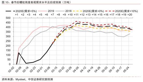 复工持续加速的背景下,需求阶段高点有望在4月初出现。按照悲观、中性、乐观三种情形从农历尺度进行需求弹性预测,在需求的加速恢复下,预计今年节后的螺纹表观消费阶段高点将在4月初出现,按需求高点同比+0%/+5%/+10%计算,分别对应422万吨/443万吨/464万吨,后续则按照往年季节性变化进行预测。