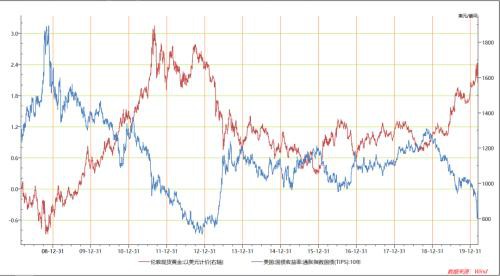 因为黄金用美元标价,投资常常也将黄金当成美元的反向指标工具,即美元涨、黄金跌,美元跌,黄金涨,但这也是误区,美元指数与黄金整体上是负相关关系,但并不密切,黄金之所以与美元有负相关关系,都是美国利率在背后起到共同的作用,黄金与美元都是利率的结果。下图我们比较黄金价格与美元关系,黄金价格与美国十年期通胀指数国债TIPS关系图来看,黄金价格与TIPS的关系远远比黄金与美元的关系密切。通货膨胀保值债券(TIPS),始于1997年,是由美国财政部发行,目前全球规模最大与消费者价格指数(CPI)挂钩的债券,通货膨胀保值债券的基本特征是固定息票率和浮动本金额,其中,本金部分将按照美国劳工部的月度非季调城市CPI指数进行调整。