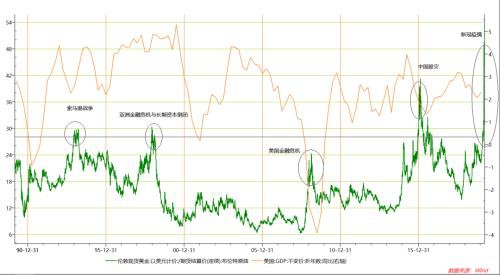 于此要说明的是,金油比是交易指标,是高频快指标,GDP等经济增长是慢指标,快指标是慢指标的领先指标,GDP历史数据并不能预测金油比,金油比可以指示未来GDP将大幅下滑,甚至衰退。疫情全球扩散后,逻辑分析表明,要控制疫情必须大隔离,对经济的伤害堪比2008年,金油比才开始在原油供给打击下突破30,不断创出历史新高。在历史上也有例外,2000年经济衰退金油比上升并不大,其原因是那一次是互联网泡沫,是虚拟经济的泡沫,彼时中国经济还未崛起,互联网泡沫对大宗商品的需求影响很小。