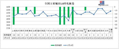 我的钢铁讯:3月19日,各黑色系品种现货价格全线下跌。受国际金融市场全线走弱的影响,早盘黑色期货大幅跳水,上午国内建材价格小幅回落。午后,Mysteel数据显示本周国内钢材产量小幅增加,同时钢厂库存及社会库存明显下降,表明下游用钢需求加速恢复,下午螺纹、铁矿等期货价格明显反弹,市场心态稍有好转,成交较上午有所放量,价格底部亦有所上移。
