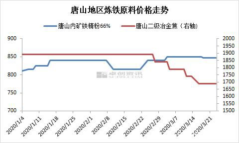 通过图1可以看出,进入2020年以来,生铁成本运行整体呈现震荡下跌趋势。元宵节过后走势短暂反弹,反弹周期约14天,随后下行趋势延续。据卓创测算,唐山地区铁水成本,截至3月中旬末为2440元/吨,较年初2560元/吨下跌120元/吨,跌幅4.69%,与去年同期相比下跌233元/吨,跌幅8.72%。如图2所示,铁矿石元旦过后整体走势上行,这其中有钢厂刚需带动的成交,同样外矿利好消息频出也稳定了成交价位。而焦炭价格先稳后跌,春节过后完成四轮提降,累跌200元/吨,单从焦炭角度来讲,生铁成本已跌100元/吨。