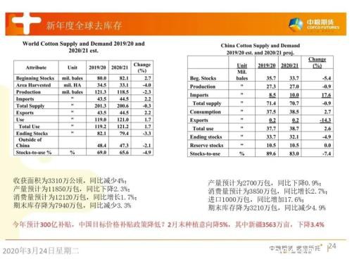 目前,新冠疫情内外有别,中国已经控制,国外迅猛发展,消费面临重估。国内市场:1-2月,我国纺服出口298.4亿美元,同比降19.96%;服装零售1103亿元,同比降33.20%;内需预计逐步恢复,出口则继续下行,2019/20年度国内消费因此下调110万吨至710万吨。国储棉轮入对冲了部分消费下降影响,截至3月20日,国储累计轮入29.1万吨,全国棉花销售进度54.3%。下游纱厂成品库存向上拐头,纺纱利润仍刺激原料补库,外需崩塌冲击下,棉纱后市会补跌。下游织厂成品库存向上拐头,原料补库很谨慎。全球市场,最坏的情况下预计消费下调351万吨至2266万吨,全球期末库存会增加381万吨至2127万吨,接近2015/16年度水平。当时,美棉最低价54.4美分/磅,目前最低价53.7美分/磅,已Price in消费崩塌预期。经过中美贸易摩擦和新冠肺炎疫情的双重打击,棉价跌至历史低位,对大宗商品估值也处于近15年最低,对于资产配置来讲安全边际很高。