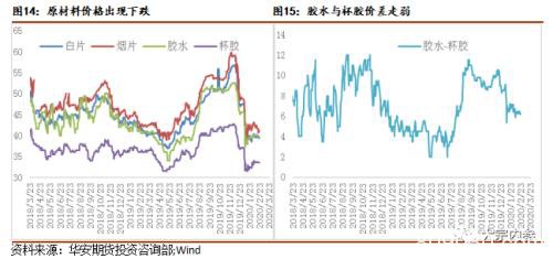 杯胶价格处于警戒线下方,原材料价格持续低迷或将导致供应阶段性收缩。一般来说,对杯胶而言,杯胶价格在32泰铢/公斤基本是弃割的分水岭,进入4月,东南亚主产区将陆续开割,但原料价格若持续低迷,胶农割胶意愿下滑,供应端收缩修复供需矛盾,胶水和杯胶是橡胶树同时产出的原料,杯胶是胶水自然凝固在割胶杯上形成的, 因杂质含量高,所以价格更便宜。杯胶主要制作标胶,标胶用于轮胎制作,疫情的影响对轮胎厂造成直接影响,进而对杯胶的影响较胶水影响大。