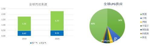 图表:全球丙烷10年增长主要来自于伴生气 图表:全球LPG供应2亿吨
