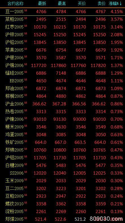 金融界网站3月27日讯 国内期货市场早盘收盘,商品期货多数上涨,农产品(行情000061,诊股)涨幅居前,豆一涨超4%,菜粕、红枣涨超3%,沪锌涨超2%,沪铅、苹果、沪银、沪锡等涨超1%;PP跌近4%,塑料、甲醇、硅铁跌超2%,乙二醇、PVC、原油等跌超1%。