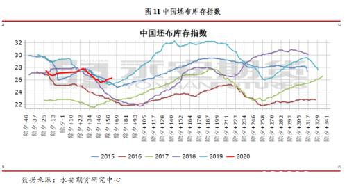总结来说,伴随着复工,织造行业依旧面临着两大困境:行业效益低下以及订单的缺失。由于3-4月份是服装企业夏季订单的集中期,受此次公共卫生影响,多数订单推迟,对于服装企业生产的刚性需求来说,短期内会有赶订单,即需求报复性回复的时期,但由于终端消费的萎靡,从订单的绝对量来说,后期仍然面临着较大的压力,且国外部分订单在事件影响下会发生转移,对后期消费的提振同样造成压力。同时作为终端的纺服行业,在国际疫情持续的悲观下,后期国外的需求预计进一步下滑,这将直接作用于国内织造的内需容量。下图为中国坯布库存指数变化趋势图,可以看到传统3-4月份是去库的旺季,而目前坯布库存的去化受到了明显的阻力。