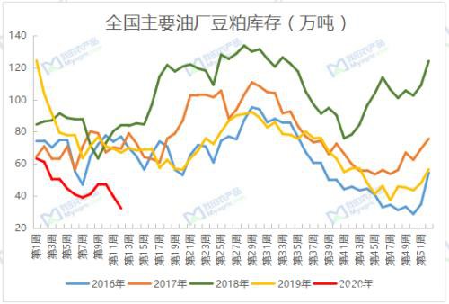 据我的农产品网对国内111家主要油厂调查显示,2020年第12周,全国主要油厂大豆库存、豆粕库存及未执行合同均下降。其中大豆库存210.2万吨,较上周减少21.63万吨,减幅9.33%,同比去年减少182.8万吨,减幅46.51%;豆粕库存为32.07万吨,比上周减少7.37万吨,减幅18.69%,比去年同期减少34.86万吨,减幅52.08%;未执行合同427.65万吨,较上周减少31.31万吨,减幅6.82%,比去年同期增加142.27万吨,增幅49.85%。第12周大豆实际压榨量为127.17万吨,开机率为45.10%,第11周为143.26万吨,开机率50.81%。
