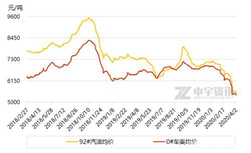 从第一季度国内汽柴油价格走势图中可以看出,今年前三个月,汽柴油价格呈现一路走跌的趋势,据中宇资讯统计数据显示,1月初我国汽柴油均价分别为7170、6940元/吨,但经历了国内疫情爆发、海外疫情蔓延,全球经济陷入萧条阶段,而沙俄掀起的价格战,更使得原油市场上演了多年的罕见行情,价格面不断探底,市场悲观气氛浓厚,截止4月初,国内均价已跌至5500、5400元/吨,跌幅分别为1670、1540元/吨。而分地区来看的话,目前华南、华东、华北地区的汽柴油市场成交价格均跌破5000元/吨的关口,迫于出货压力,各地低价资源频现。