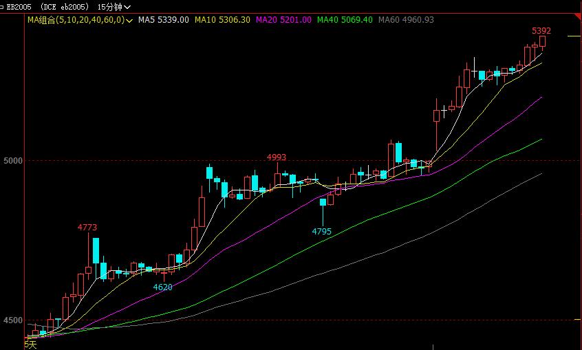 金融界网站4月9日讯 国内期货市场,苯乙烯主力合约EB2005尾盘涨停,涨幅9.00%,现报5392元/吨。