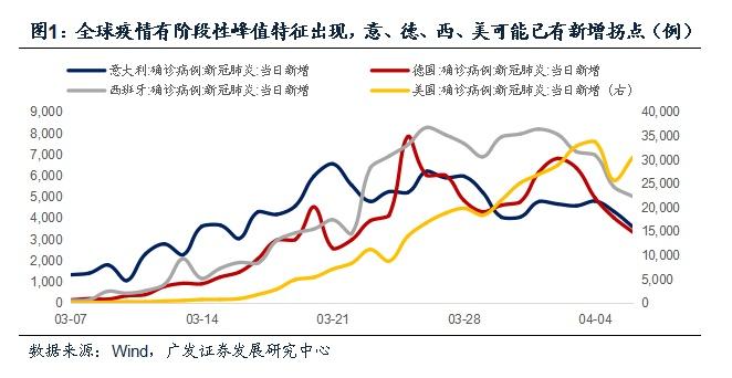 全球疫情有阶段性峰值特征出现,意、德、西、美可能已有新增拐点,或已处于顶部平台期。