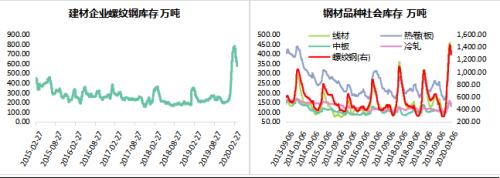 国内需求3月逐步启动,终端需求开始恢复,钢厂高炉开工率持续上升,铁矿石日均疏港量在国内运输恢复后持续上升至高位。钢厂进口烧结粉矿总日耗稳步抬升,库存消费比低位运行。长流程炼钢利润稳定在正常偏高水平,低于2019年同期。预计二季度国内生铁产量呈现底部回升的状态。由于2020年成材库存创下历史高点,在3月中上旬虽已迎来拐点,但库存水平仍高于往年同期。以螺纹钢为例,2020年厂库与社库之和较2019年同期高834.26万吨,仍处于高位,库存压力较大。因此,二季度生铁产量虽环比一季度将表现增量,但受制于高成材库存及下游需求释放速度,同比增幅将有所收窄。