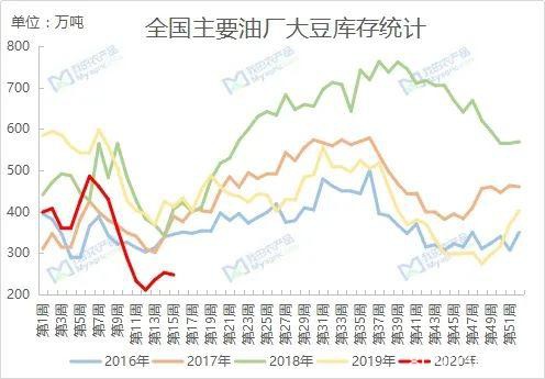 国内内供应方面,据海关数据,1-2月份进口大豆1351.4万吨,3月份我网统计大豆实际到港450.5万吨,进口量偏低,导致大豆库存持续下降至五年来新低水平。但是,我的农产品网对国内111家主要油厂调查显示,2020年第16周,全国主要油厂大豆库存为246.86万吨,较上周增加17.15万吨,增幅7.29%,大豆库存已连续三周上升,第16周(4月13日至4月19日)国内大豆压榨预计为164.45万吨,开机率为58.32%。据了解四月份大豆到港预计670万吨,五月份到港预计1100万吨。随着后续到港的增加,大豆库存紧张的局面也将有所缓解,油厂开机率也将有所回升,豆粕库存持续多年低位的局面也将改善。
