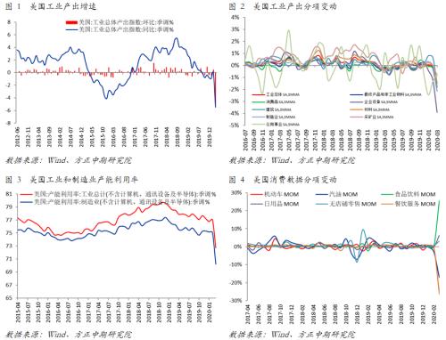 需求端,美国3月零售销售月率录得-8.7%,创该数据以来的纪录最差表现;供给端,美国3月工业产出环比萎缩5.4%,创该数据发布以来的记录新低。消费者支出占美国经济活动的80%,工业生产占而美国经济活动的16%左右,两者均创新低说明美国经济将会大幅衰退,预计美国一季度经济将会录得2%-5%的负增长;美国很多的州于3月下旬4月初开始加强隔离与管控,故3月零售和生产数据依然没有体现当前的更加疲弱的现状,故4-5月零售和供给数据均会继续大幅下降,美国二季度经济将会萎缩15%以上。