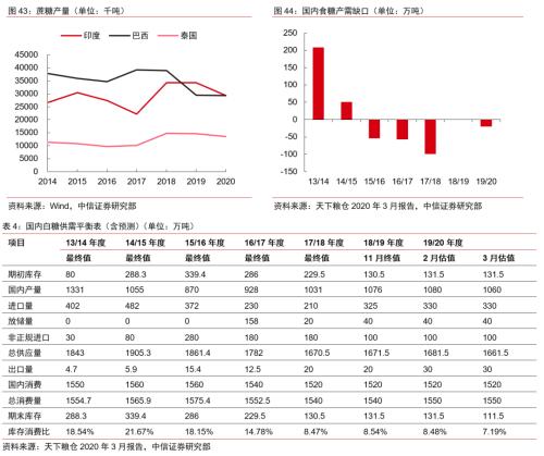 国内方面,目前已经全面进入收榨阶段,预计2019/20榨季糖产量1020万吨,较上一榨季减少56万吨。消费端,前期国内疫情蔓延,封城、停工等措施导致食品饮料行业受到影响。目前企业逐步复工复产,预计国内全年食糖消费或有小幅下降。