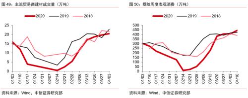 3月需求加速恢复,在中下旬已恢复至与往年相当的水平。螺纹下游需求的恢复可以通过表观需求以及建材成交数据进行跟踪。从螺纹表观需求数据来看,春节后第6周(3月初)开始加速恢复,在春节后第8周(3月中下旬)已经恢复至往年同期水平。建材成交量数据与螺纹表观需求的表现基本一致,日成交量领先表观需求1周在节后第7周恢复至往年同期水平。一方面印证了三月需求在加速恢复,另一方面说明在需求从下向上传导过程中,贸易商更敏感地感受到下游需求恢复的来临,存在提前备货的行为。