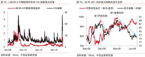 政策“放水”效果显著,美元指数将承压下行。在美国政府货币和财政政策双重释放流动性的背景下,LIBOR-3月期国债利率和VIX指数均在3月底大幅下调,显示市场流动性和恐慌情绪的紧张形势短期得到缓解。复盘美国2008年危机的流动性释放节奏,本轮危机的流动性刺激的规模和节奏都超出08年,预计美元指数未来难有涨势,下行压力大。